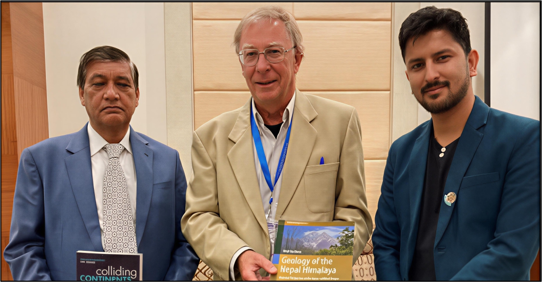 With Nepal’s geological legends, Professor Dr. Megh Raj Dhital and Professor Mike Searle, at the 11th Nepal Geological Congress (NGC–XI), Kathmandu, Nepal